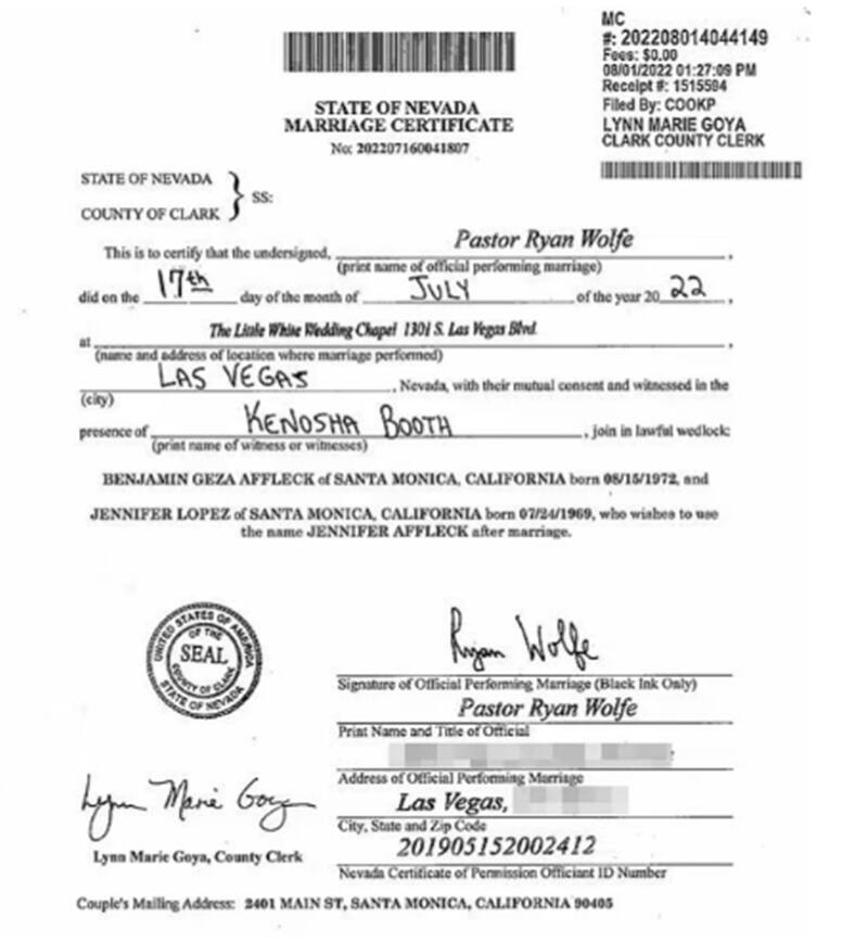 En la foto filtrada por el medio TMZ, aparece en el certificado de matrimonio de Jennifer López y Ben Affleck que la boda fue registrada el 17 de julio, aunque se sabe que se realizó un día antes, y de acuerdo con la Oficina del Secretario del Condado de Clark, fueron casados por el pastor Ryan Wolfe y que su principal testigo fue Kenosha Booth. El documento completo se puede ver en este enlace.