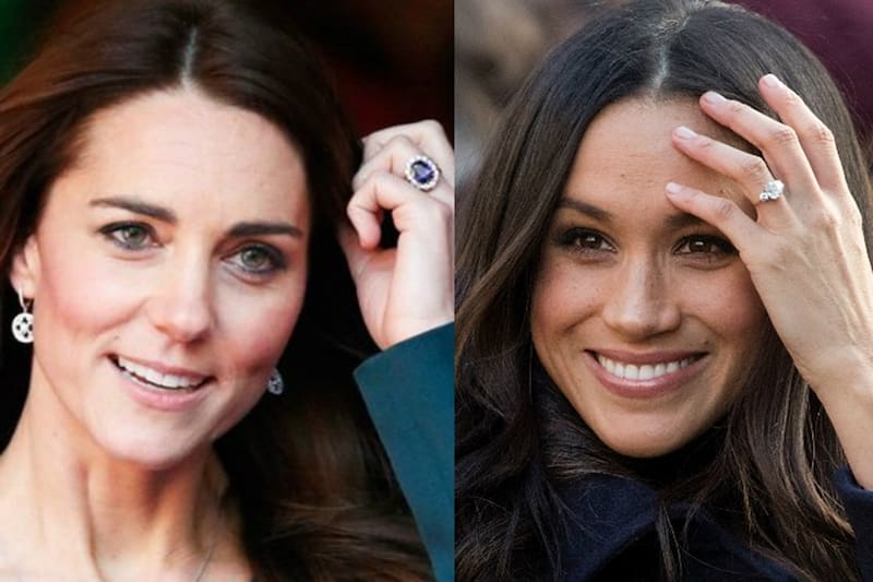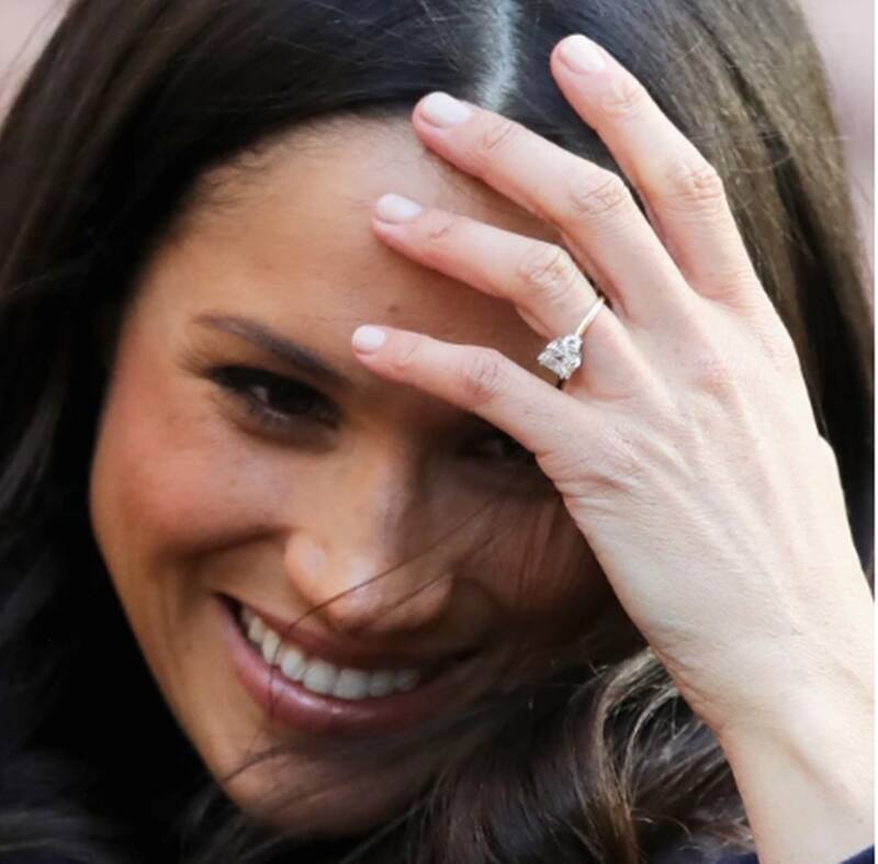El anillo que hoy lleva Meghan Markle fue elegido cuidadosamente por el príncipe Harry, quien lo diseño en conjunto con la casa Cleave and Company. El diamante central procede de Botsuana, un país con significado especial para la pareja, pues ahí viajaron juntos en su tercera cita. Lo acompañan dos diamantes pertenecientes a la princesa Diana, montados en una sortija de oro amarillo, el favorito de Meghan. En 2019, le hizo un pequeño gran cambio, pues pidió a la joyera Lorraine Schwartz que cambiara la banda original por una con pavé de diamantes.