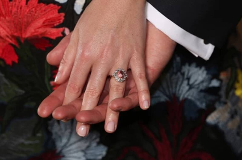 Jack Brooksbank regaló a la princesa Eugenia, nieta de la reina, un anillo realmente único cuando le pidió matrimonio en un lago en Nicaragua. Se trata de un zafiro padparadscha -uno de los más raros del mundo- de 3 a 4 quilates rodeado de diamantes en una banda de oro galés, como lo indica la tradición real. El nombre del zafiro viene de la palabra en sánscrito que se da al color coral de una flor de loto. Expertos en joyería calculan que su valor es superior a los 100 mil dólares.