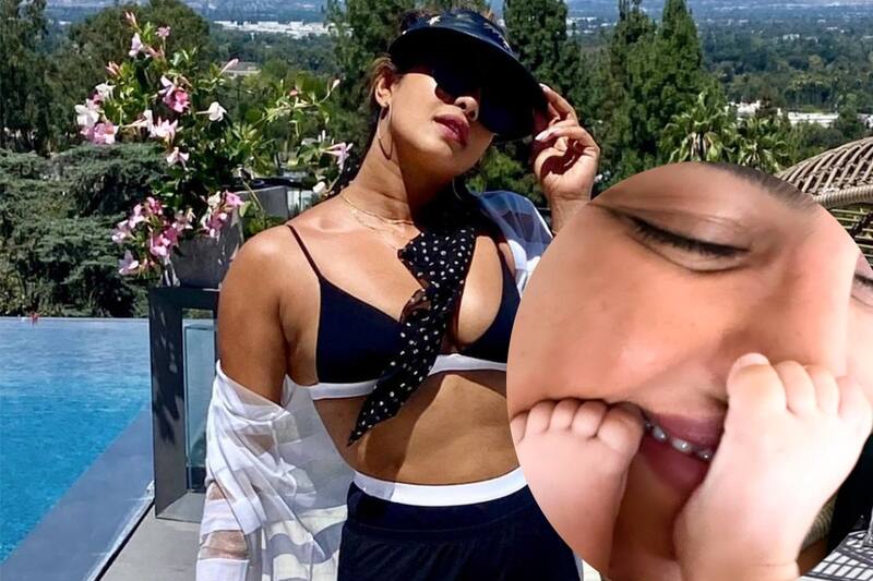 La primer instantánea muestra a la actriz cargando a la pequeña Malti en sus brazos y en la segunda los pies de la bebé aparecen tapando la boca de la reina de belleza.