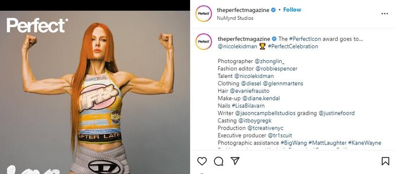 Nicole Kidman estuvo bajo las ordenes de la estilista y directora creativa británica Katie Grand para logra la portada de "Perfect y fue la profesional quien compartió en su cuenta de Instagram otras fotos de la ganadora del Oscar. La sesión fotográfica incluyó que la estrella de Hollywood posara en movimientos atléticos.