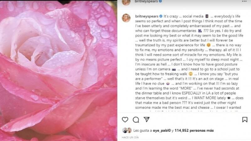 A casi un año de que la cantante se liberara de la tutela de su progenitor, "La princesa del pop" no dejó de mostrarse transparente sin ningún tipo de restricciones en sus redes sociales: "Es verdad, trato de salir lo mejor posible o mostrando lo que parece ser una gran vida en las redes... Y es cierto que mi ánimo ha mejorado, pero estaré traumatizada de por vida debido a mis experiencias del pasado. No hay forma de arreglarme: mis emociones y mi sensibilidad... Terapia, todo eso. Creo que necesitaré un milagro para mis emociones", aseguró en su momento.