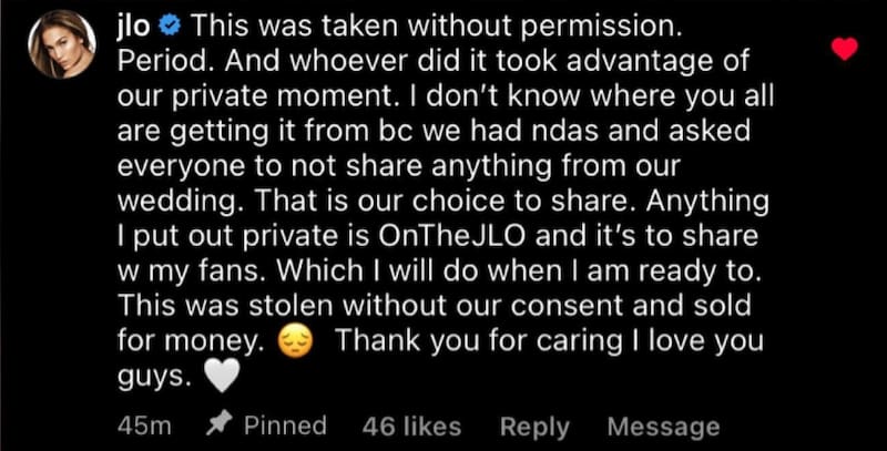 Además agregó: "No sé de dónde lo consiguieron porque teníamos un acuerdo de confidencialidad y le pedimos a todo no compartir nada de nuestra boda. Esa es nuestra decisión". También aprovechó para recordarle que cualquier cosa podrían verla en su sitio "OnTheJLo", donde compartiría especialmente para sus fans.