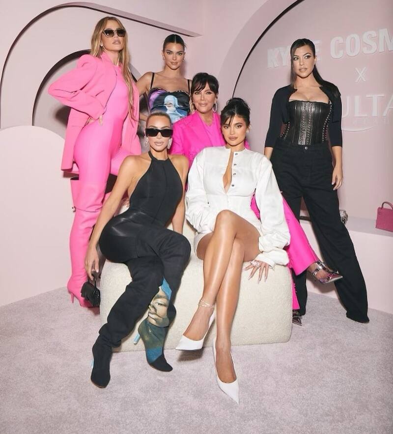 Las hermanas Kardashian y su madre, Kris Jenner, se reunieron en el evento de lanzamiento de la línea de Kylie Cosmetics x Ultra Beauty organizado por Kylie Jenner.A la fiesta de presentación llegaron todas las hermanas Kardashian. A Kourtney la acompañó Travis Barker, Kim llegó con un look totalmente en negro en spandex, Khloé y su madre llegaron en trajes rosas casi idénticos y Kendall lució un precioso vestido estampado.