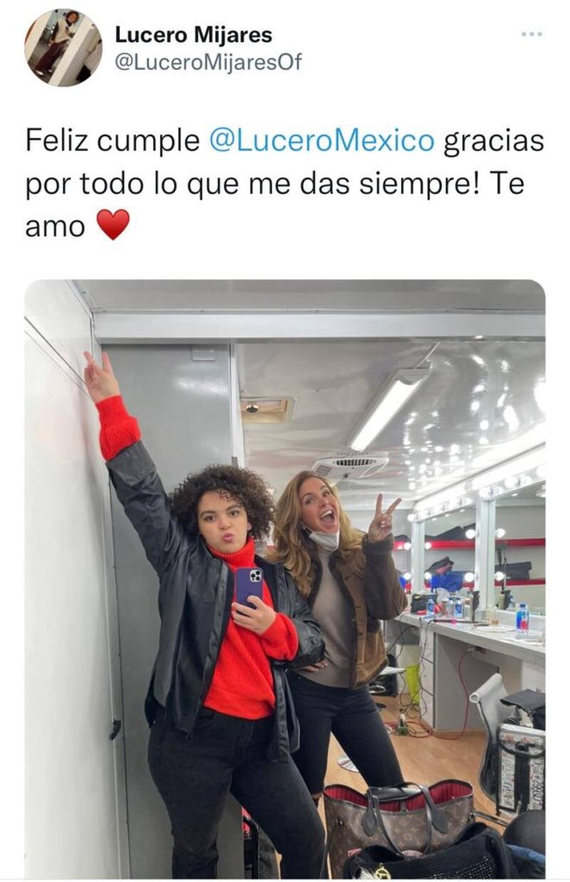 "Feliz cumple @LuceroMexico gracias por todo lo que me das siempre! Te amo", escribió en su Twitter Lucero Mijares.