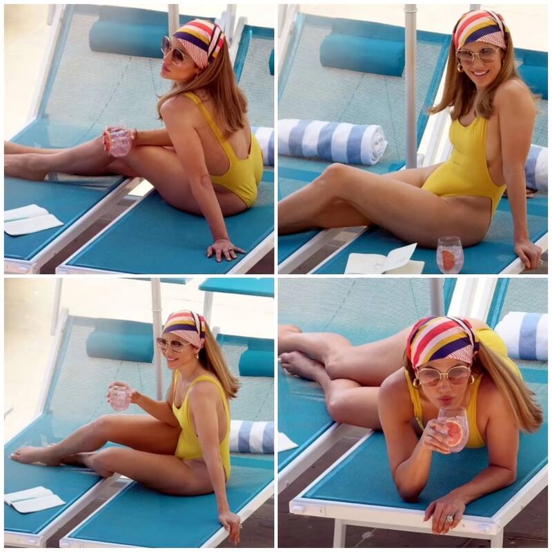 En otra foto, la protagonista de "Marry Me" se relajó en un camastro con un traje de baño Norma Kamali amarillo brillante de corte alto con un colorido pañuelo en la cabeza y aros dorados.