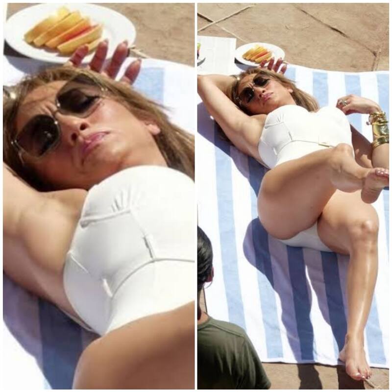Tras deleitar a sus fans con sus looks costosos, ahora, Jennifer Lopez deslumbró en una sesión de fotos en traje de baño. La primera de ellas lució un traje de baño blanco con cinturón. Su look lo completó con brazaletes dorados en su muñeca izquierda y anteojos de sol de gran tamaño.