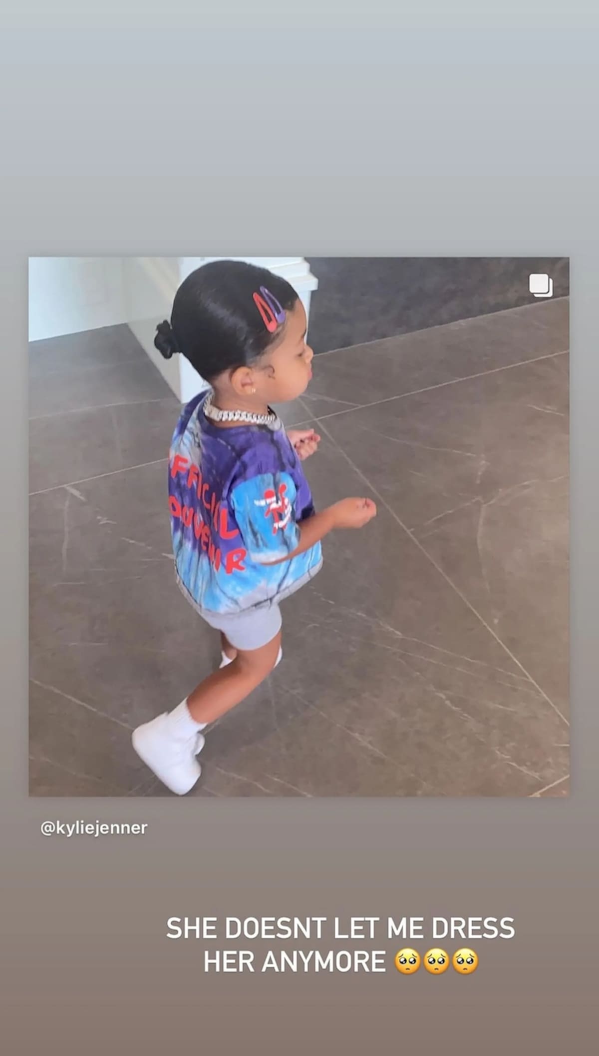 Sin embargo, Kylie Jenner ha confesado que ese gran estilo que caracterizaba a Stormi se debía a la creatividad de la empresaria, pero que su hija ya no la deja escoger su ropa. "Ya no me deja vestirla más", escribió en una de sus historias junto a emoticones de con ojos llorosos.