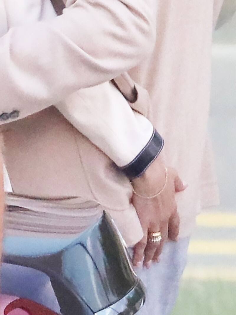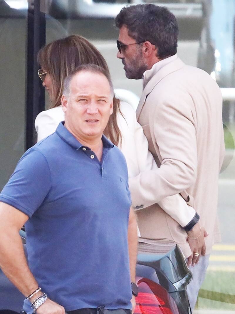 Bennifer lucieron chaquetas y gafas de sol casi idénticas. La chaqueta de Jennifer era un poco más clara y de un color más blanquecino, mientras que la de Ben era beige. Aparte de las gafas de sol, Jennifer tenía algunas joyas increíbles en la mano que descansaba sobre la espalda de su esposo. Además de un enorme anillo, también tenía un sutil y delgado brazalete de oro.