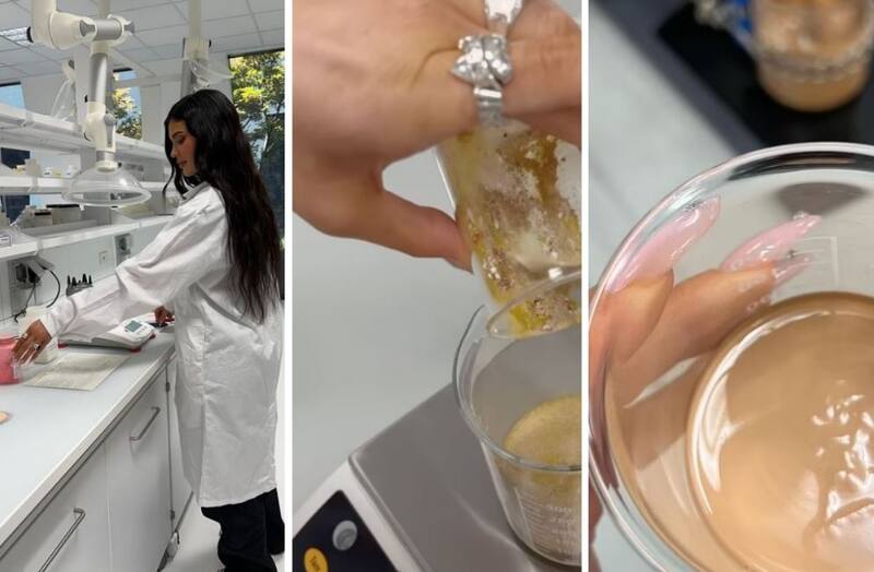 En las imágenes se puede ver a la menor del clan Kardashian-Jenner vestida con una bata blanca mostrando a sus seguidores detalles de cómo se fabrican sus cosméticos.