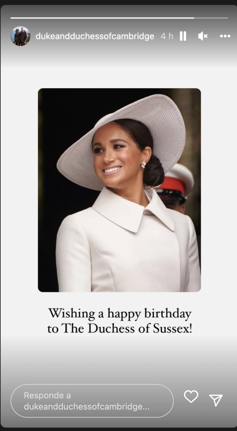 El príncipe William y Kate Middleton ya desearon "un feliz cumpleaños a la duquesa de Sussex", a través de una publicación en sus redes sociales. Los fans de la realeza se sorprendieron con dicha felicitación ya que saben el distanciamiento que existe entre los hijos de Lady Di y sus respectivas familias.