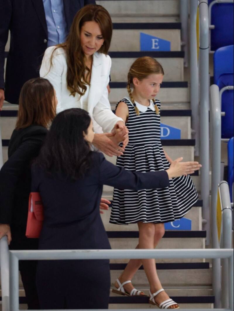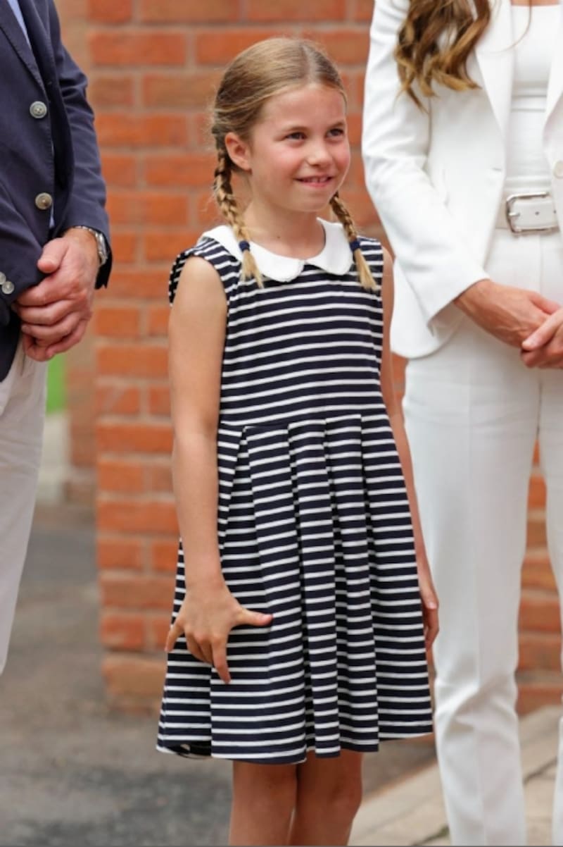 La pequeña hija de los Duques de Cambridge hizo una aparición sorpresa junto a sus padres en la sexta jornada de los Commonwealth Games celebrados en Birmingham. Por primera vez la vimos peinada con un par de pequeñas trenzas usando un vestido a rayas horizontales blanco y negro con cuello Peter Pan.
