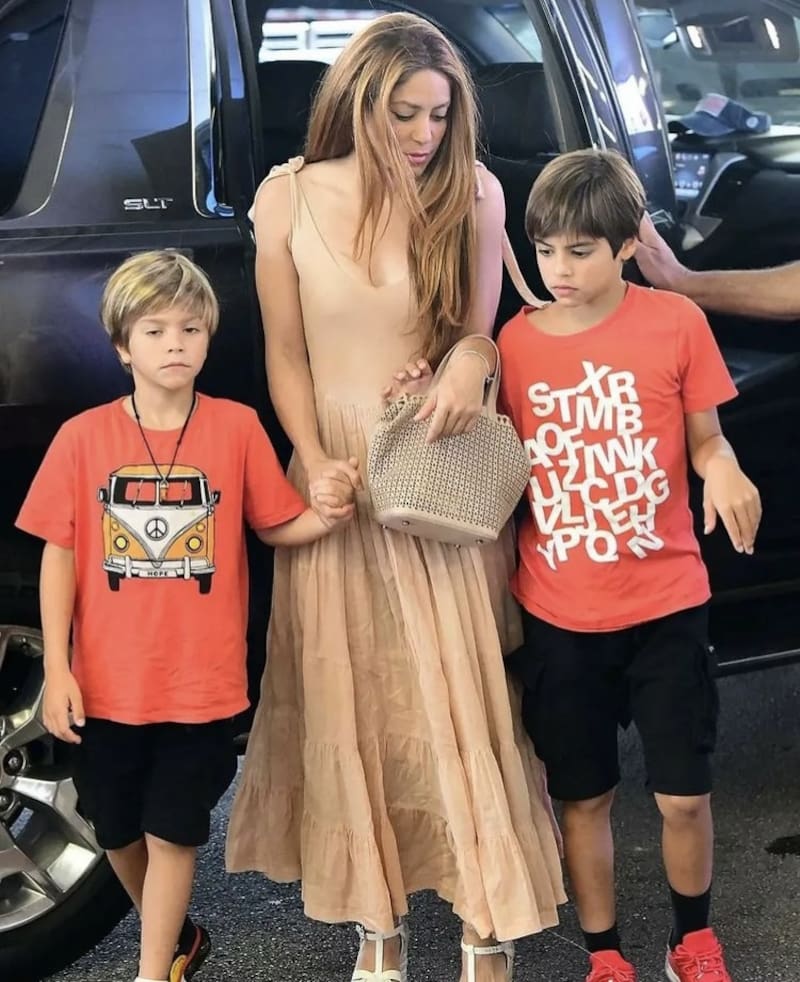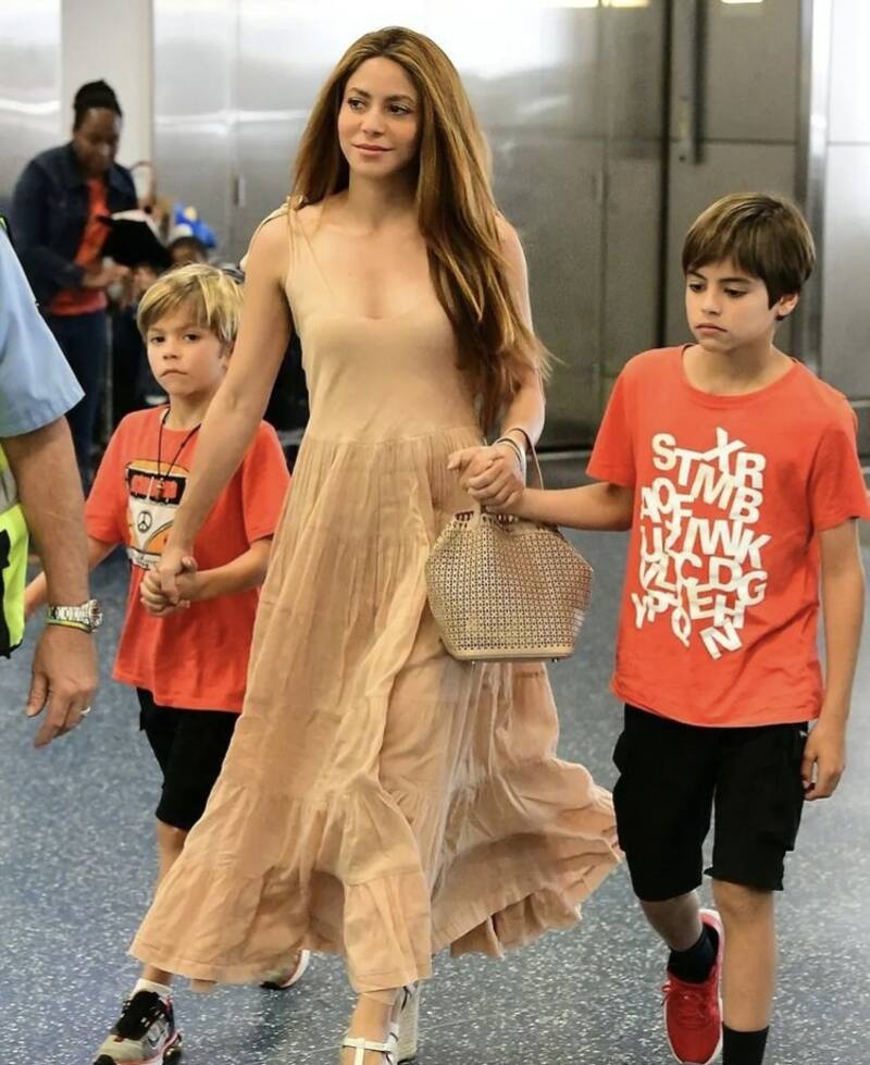 Según se puede apreciar en los videos que circulan, la cantante puso cara de valiente y sujeto bien a sus hijos para caminar por el aeropuerto de Miami. Además de que como ya es costumbre mostró su glamour al lucir un vestido nude de verano, el cual combino con unas sandalias de plataforma blanco con beige.