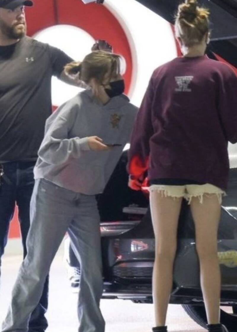 La joven de 16 años utilizo en todo momento cubrebocas negro, y uso un look informal con short blancos deshilachados, tenis Vans negros y una sudadera vintage color vino con un estampado con la leyenda "No fear", y la cual actualmente está agotada pero tenía un costo de 90 dólares.