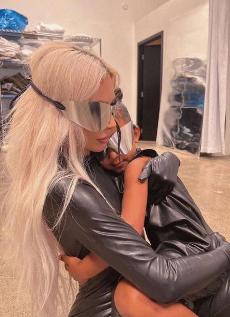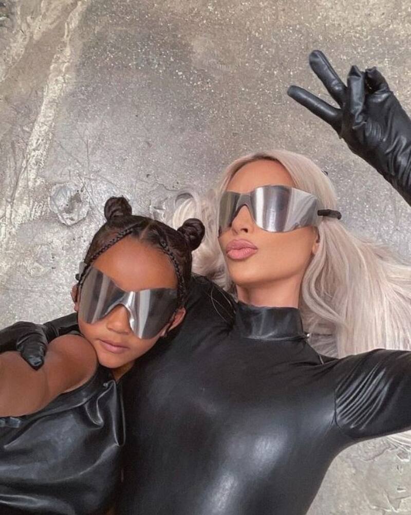 Kim Kardashian sorprendió a sus seguidores de redes sociales al compartir una serie de fotos posando con sus hijas North y Chicago. En las imágenes se ve a la empresaria de 41 años vestida con su ya acostumbrado jumpsuit de piel en color negro y guantes que hacen contraste con su larga cabellera plateada.