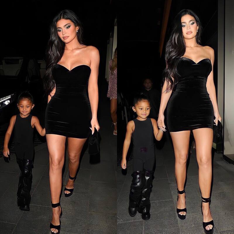 Además, a la estrella de Hulu junto a su familia se le vio llegar al famoso restaurante Nobu con un ajustado vestido negro con escote de corazón. Por otro lado, Stormi vistió un jumpsuit negro acompañado de unas botas altas del mismo color.