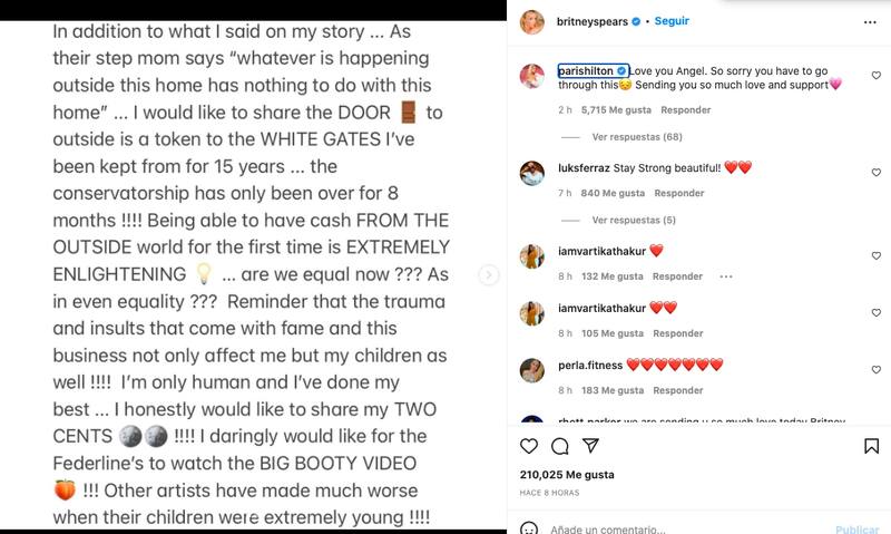 Y externó, sin dejar claro el trasfondo del comentario: "¡¡¡Recordatorio de que el trauma y los insultos que vienen con la fama y este negocio no solo me afectan a mí sino también a mis hijos!!! Solo soy humano y he hecho lo mejor que he podido... ¡Honestamente, me gustaría compartir mi granito de arena! ¡Me gustaría atrevidamente que los Federline vean el VIDEO DE BIG BOOTY [emoji de durazno]! ¡Otros artistas lo han hecho mucho peor cuando sus hijos eran extremadamente pequeños!".