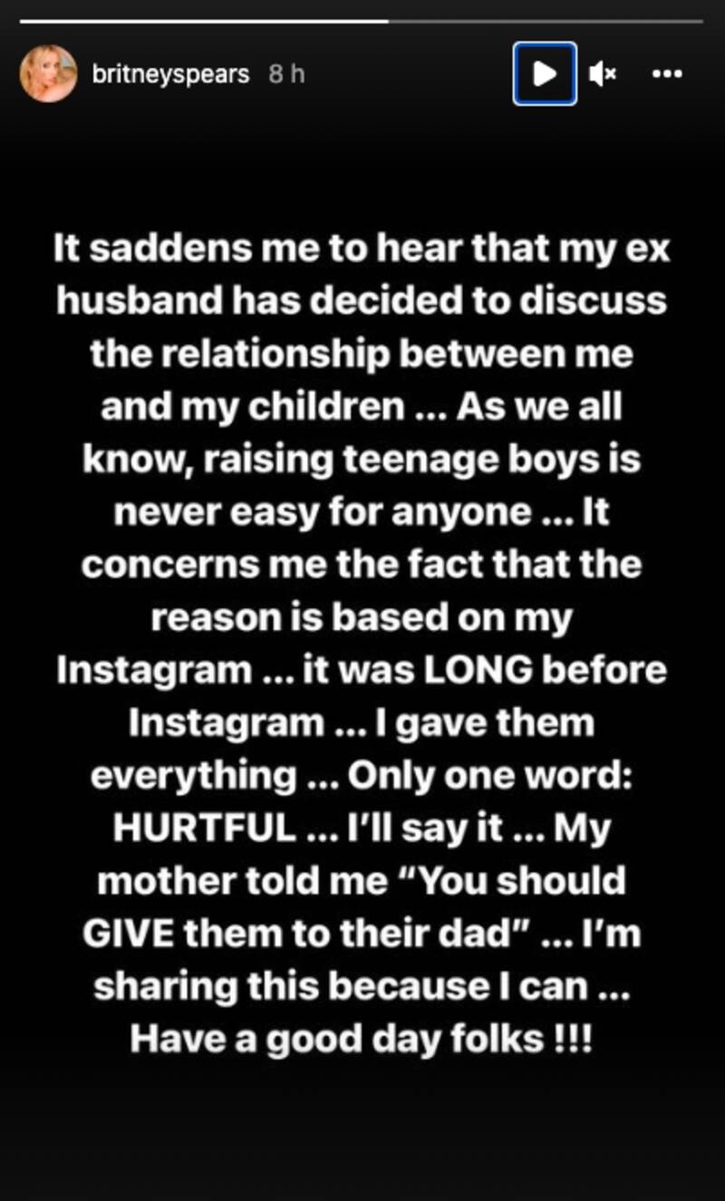 Britney Spears decidió no guardar silencio y subió un comunicado a su cuenta de Instagram para dar respuesta a los dichos de Kevin. "Me entristece saber que mi exesposo ha decidido hablar sobre la relación entre mis hijos y yo", empezó el breve mensaje compartido en sus historias.