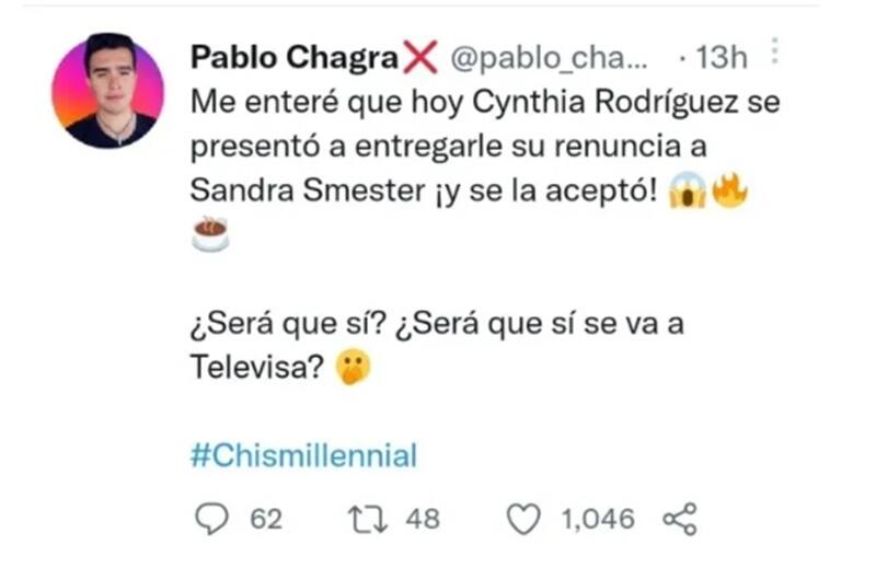 Cynthia Rodríguez se convirtió en tema de conversación en redes sociales y no precisamente por presumir su romance con el cantante Carlos Rivera, sino porque de acuerdo al influencer Pablo Chagra, la cantante habría renunciado a TV Azteca, lo cual desató una nueva ola de rumores sobre un próximo debut en Televisa.