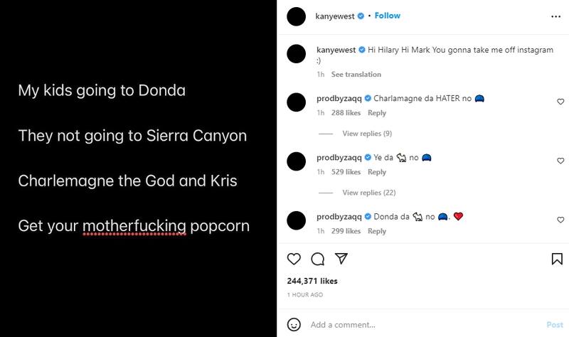 Antes, advirtiendo que Mark Zuckerberg lo iba a sacar de Instagram, escribió que "mis hijos van a Donda / No van a Sierra Canyon", haciendo clara alusión a que él no estuvo de acuerdo con que North, Saint, Psalm y Chicago fueran a esta escuela ubicada en Chatsworth, California. En esta publicación lanzó también su primera dardo contra Kris Jenner, diciendo que consiguiera una palomitas de maíz.