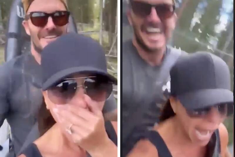 “David, ¿qué estamos haciendo?” le pregunta la famosa a su esposo, a lo que el futbolista responde: “Tú dime. Vamos en una montaña rusa”.