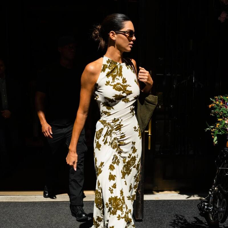 El vestido, que es largo hasta los tobillos, tiene caída fluida, es ceñido al cuerpo y están diseñados con una apertura frontal. Con respecto a los accesorios, Jenner optó utilizar lentes color camel y un maxi bolso.
