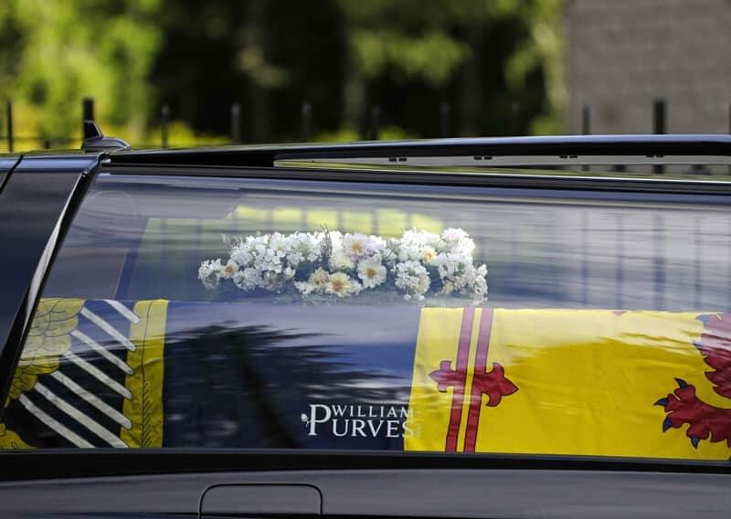 Tal y como puede verse en las imágenes, el féretro está cubierto con el estandarte real de Escocia y una corona de flores blancas para la que se han utilizado algunas de las flores favoritas de la Reina: dalias, flox, brezo blanco y abeto, además de guisante de olor o arvejilla, que es una especie muy singular.