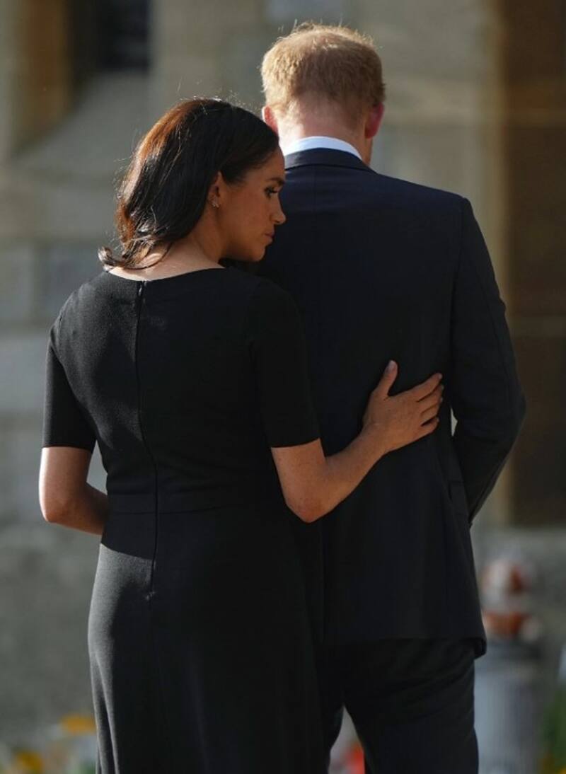 Ante el difícil momento que vive su esposo, Meghan Markle puso un brazo consolador alrededor de su esposo, mientras continuaron con su recorrido para ver los cientos de arreglos florales que se colocaron afuera de la residencia real.