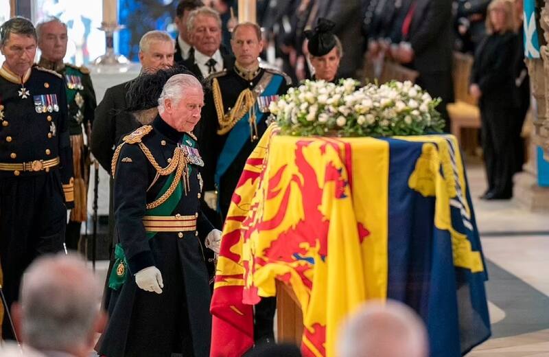 El rey encabezó el cortejo fúnebre en el que se trasladó el ataúd desde el Palacio de Holyroodhouse hasta la catedral de St Giles, en Escocia.