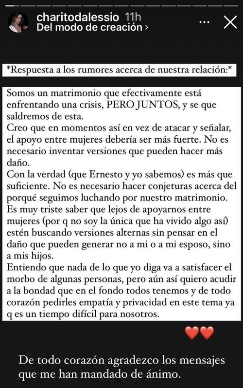 "Es muy triste saber que lejos de apoyarnos entre mujeres estén buscando versiones alternas sin pensar en el daño que puedan generar no a mi o a mi esposo, sino a mis hijos. Entiendo que nada de lo que diga va satisfacer el morbo de algunas personas, pero aun así quiero acudir a la bondad que en el fondo todos tenemos y de todo corazón pedirles empatía y privacidad en este tema ya que es un tiempo difícil para nosotros", escribió.