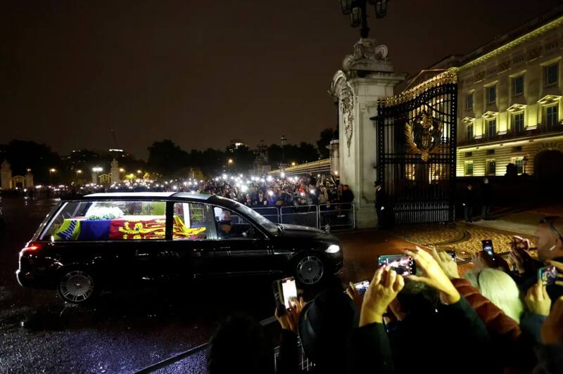 Los duques de Sussex, el príncipe William, Kate Middleton, el rey Carlos III y la reina consorte Camilla esperaron en el Palacio de Buckingham para recibir el cuerpo de la reina Isabel II que llegaba desde Escocia. El féretro de Lilibeth fue transportado en un coche fúnebre mientras una multitud se reunía afuera de los terrenos del palacio para ver la caravana y llorar la pérdida de la monarca británica.