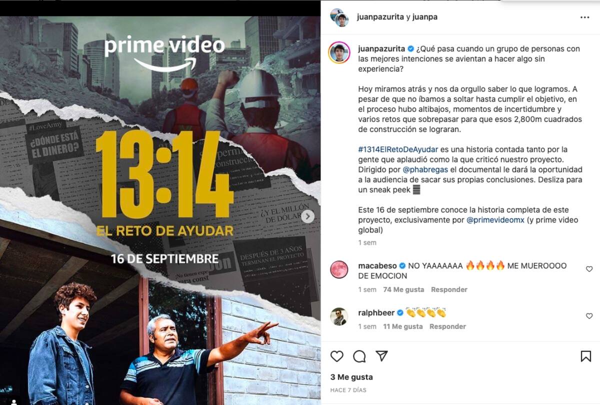 "Ese día fue muy feo, horrible, pero hubo algo bonito dentro de todo el desastre: que todos los mexicanos se pusieron bien pilas, los mexicanos y mexicanas estaban saliendo, levantando escombros, moviéndose y ese bicho del mexicano de no dejarse, creo que nos inspiró a todos", explicó el influencer durante la presentación del documental "13:14. El reto de ayudar", en el que da cuenta de un proyecto social de reconstrucción de viviendas. "Todos queríamos salir y hacer algo. Y yo estando afuera dije tienes que hacer algo. Y con lo que más impacto podía tener era mi plataforma y de ahí empieza esta historia".