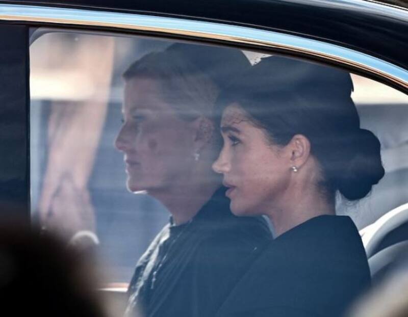 En las imágenes captadas por Mirror y otros sitios de noticias se puede ver a la duquesa de Sussex a bordo de un automóvil acompañada de Sofía, la condesa de Wessex. Mientras que Kate Middleton viajó en otro auto con la reina consorte, Camilla Parker.