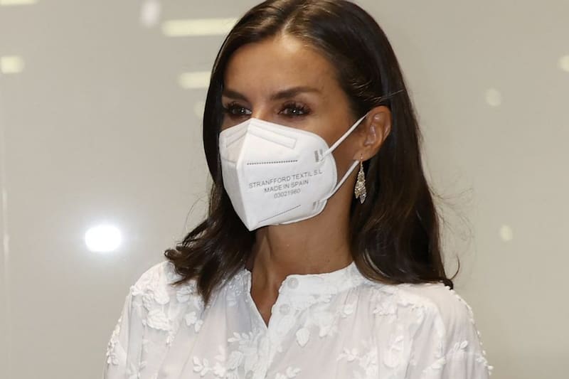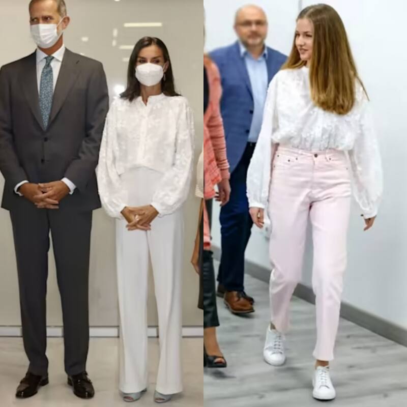 La pareja real recorrió los nuevos espacios del hospital con sus respectivas mascarillas. Para esta ocasión, la reina lució un outfit blanco con una blusa que ya se le vio a Leonor en su segundo acto oficial en solitario, la visita de un instituto de Leganés.