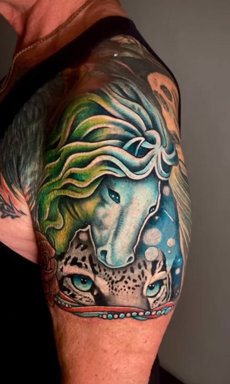El actor de 76 años una vez más recurrió al artista de la ciudad de Oklahoma, Zach Perez, para diseñar una cara de leopardo que cubrió el tatuaje que tenía en su brazo izquierdo de los ojos de su ex esposa,