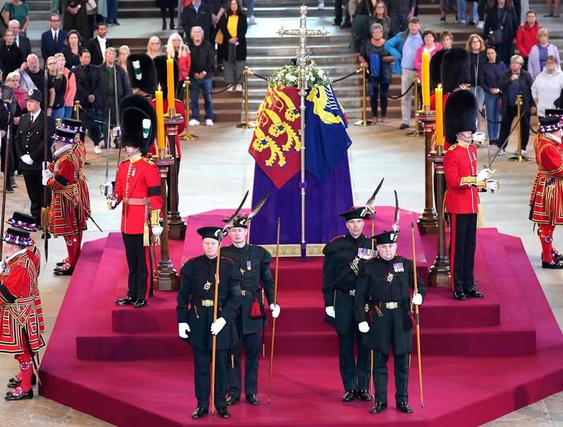 Los guardias reales mantienen una guardia permanente alrededor del ataúd de la reina Isabel, que yace en Westminster Hall. Ahí se han acercado miles de personas a presentar sus respetos.