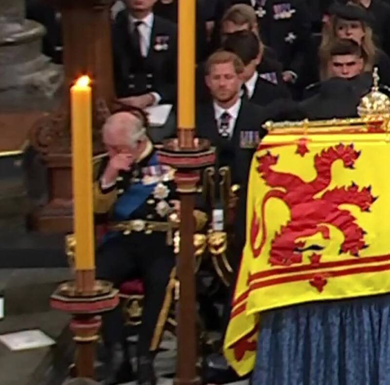 El rey Carlos III se sentó junto a sus hijos, los príncipes William y Harry, además de su esposa, la ahora reina consorte Camilla. El monarca no pudo evitar romper en llanto al escuchar el canto del cambiado himno nacional en su honor.