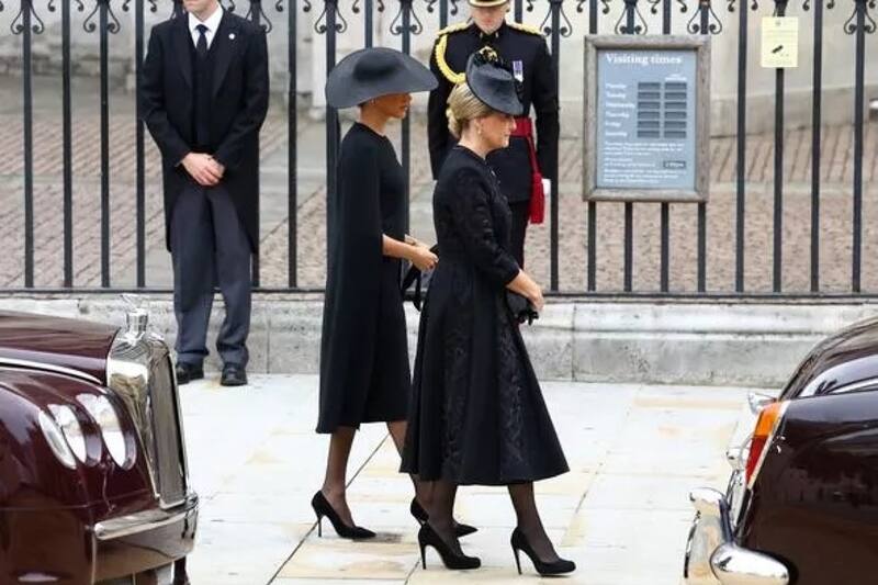 El elegante conjunto también se adhirió al código de vestimenta del funeral, que requería vestidos o abrigos negros hasta la rodilla, junto con sombreros negros y velos opcionales; mientras que el sombrero de ala ancha de Meghan Markle no incluía un velo, el de su cuñada Kate Middleton sí.