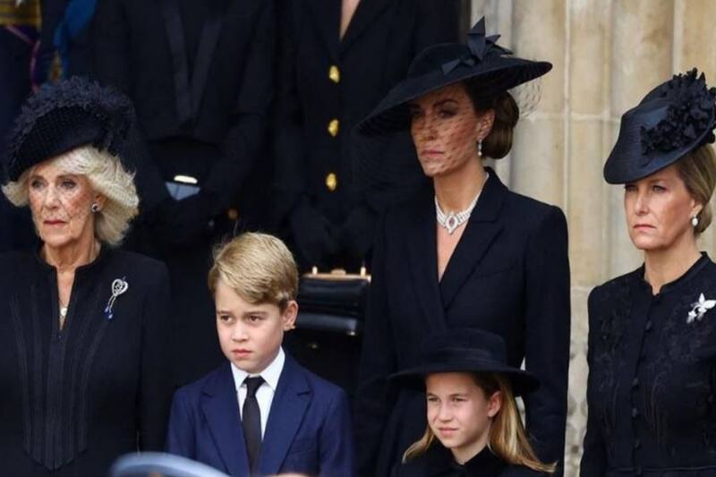 Entró en la Abadía detrás de la princesa de Gales, quien estaba con sus dos hijos mayores, el príncipe George y la princesa Charlotte, y la condesa de Wessex, a quien más tarde se le vio secándose una lágrima.
