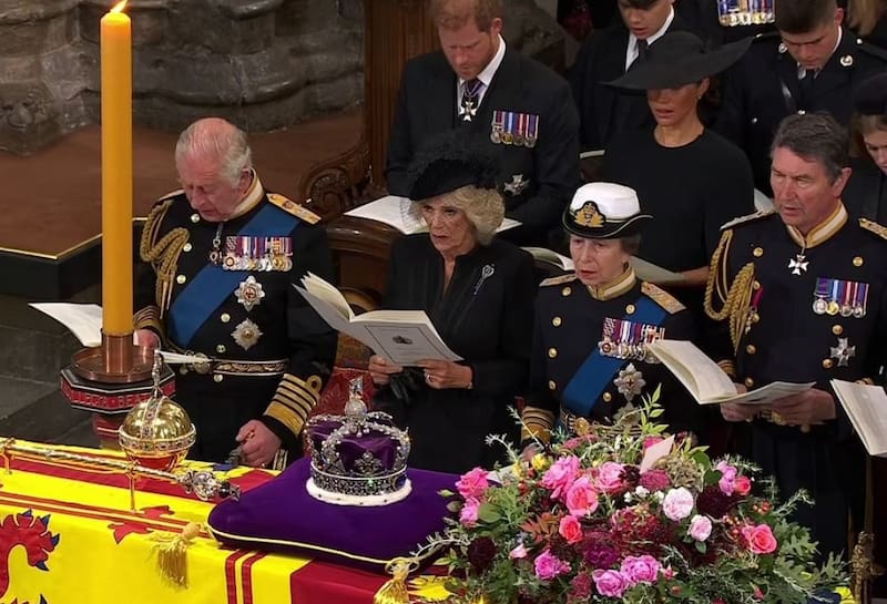 Durante el solemne acto, Meghan Markle fue captada secándose las lágrimas cuando la guardia real trasladaba el féretro de la reina al Castillo de Windsor, donde más tarde en la capilla de San Jorge, serán depositados sus restos junto a los de su familia, incluidos su esposo, Felipe de Edimburgo.