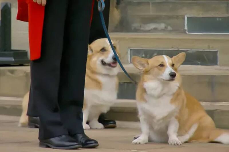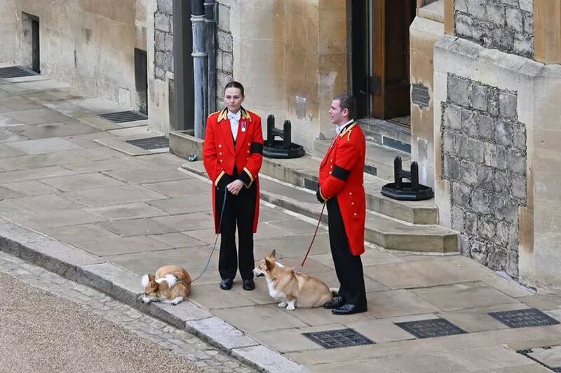Los dos perros de la difunta monarca se pararon con sus ayudantes para dar la bienvenida a su ataúd de quien fuera su dueña, antes del servicio de sepultura de la reina Isabel II. Unas horas antes fueron vistos dando un paseo dentro del Castillo de Windsor.