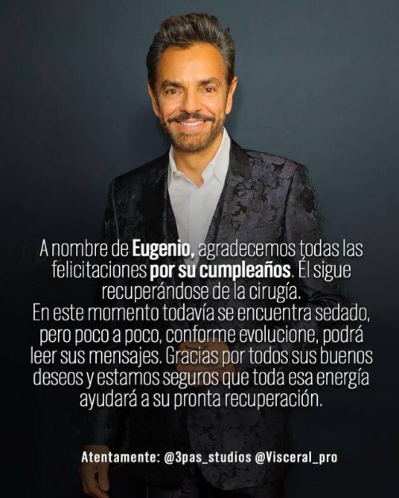 En pleno día de su cumpleaños se compartió una imagen en el Instagram de Eugenio Derbez donde su equipo agradeció las muestras de cariño y dio más información sobre el estado de salud del actor. Mencionaron que aún está sedado pero poco a poco, mientras vaya recuperándose, leerá cada uno de los mensajes de su familia, amigos y seguidores.
