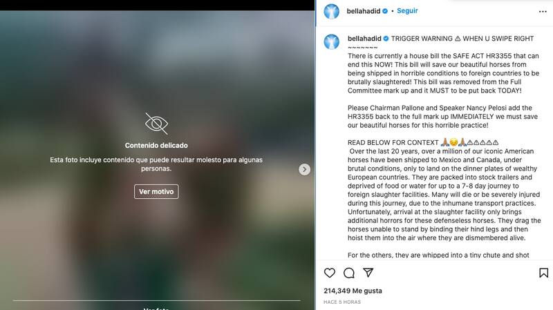 Bella Hadid, la hermana menor de Gigi Hadid, ha usado su cuenta de Instagram para solicitar a los congresistas Frank Pallone y Nancy Pelosi, la reincorporación de un proyecto de ley, la el SAFE ACT HR3355, en defensa de los caballos.