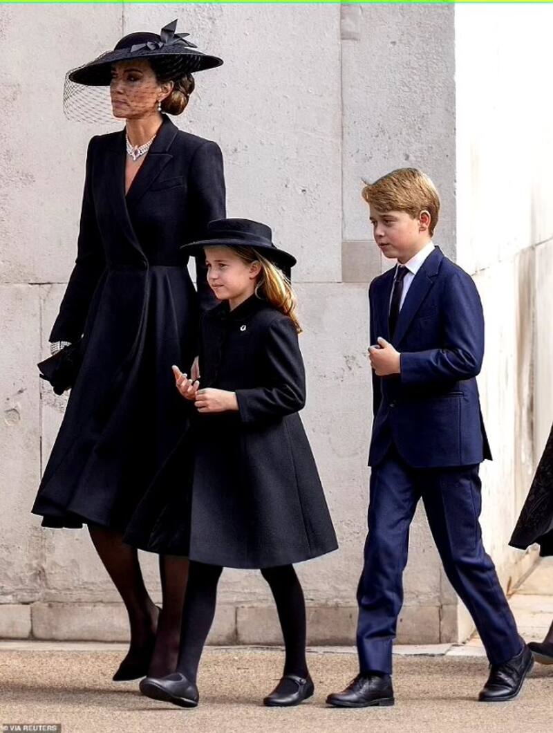 Además de su semblante triste, el hijo mayor de Kate y William captó la atención debido a que vistió traje azul marino, mientras que su hermana, la princesa Charlotte vistió de negro, tal como lo hizo su mamá.