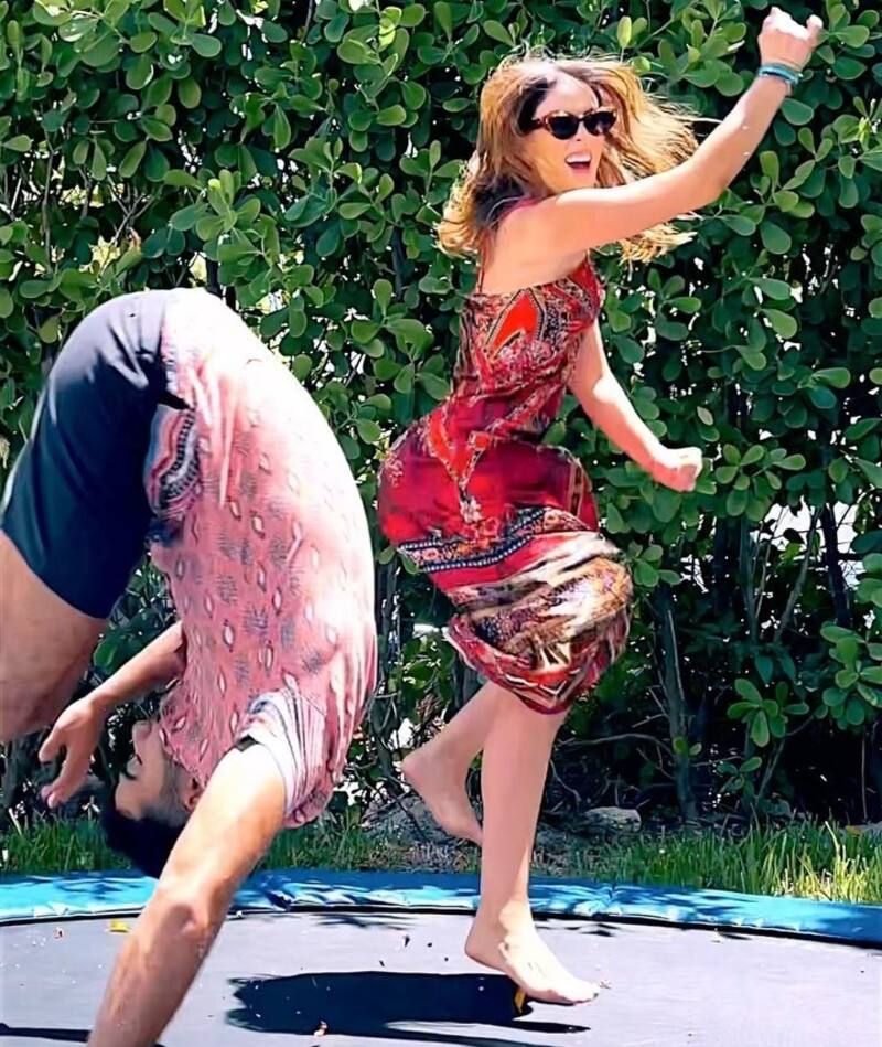 La ex reina de belleza, que usaba un vestido largo rojo quemado de tirantes y con estampados de grecas, se encontraba arriba de una cama elástica aplaudiendo.
