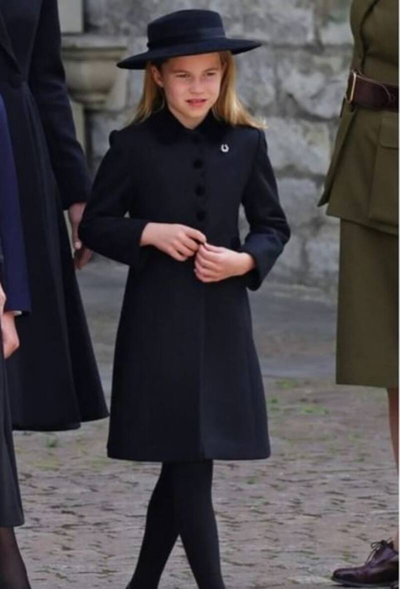 Para despedir a su querida bisabuela en el funeral de estado de la Abadía de Westminster, la hija de los príncipes de Gales, William y Kate Middleton, utilizó sobre su abrigo negro un broche de diamantes en forma de herradura, el cual se presume fue un regalo de la propia Reina, quien era amante de los caballos.