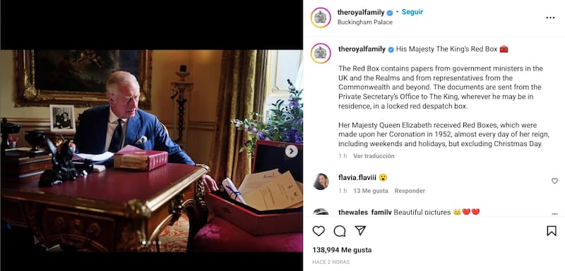 En el posteo de Instagram, que se acompañó, además de con la foto del rey, con otras tres imágenes de la reina Isabel: "La Caja Roja contiene documentos de ministros del gobierno del Reino Unido y de representantes de la Commonwealth y más allá. Los documentos se envían desde la oficina del secretario privado al rey, dondequiera que esté en residencia, en una caja de despacho roja cerrada con llave".