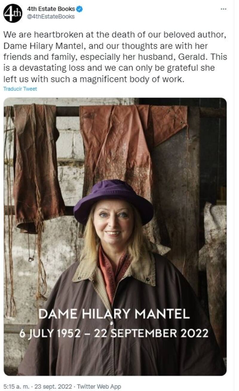 "Estamos desconsolados por la muerte de nuestra amada autora, Dame Hilary Mantel, y nuestros pensamientos están con sus amigos y familiares, especialmente con su esposo, Gerald. Esta es una pérdida devastadora y solo podemos estar agradecidos de que nos haya dejado un trabajo tan magnífico", publicó.
