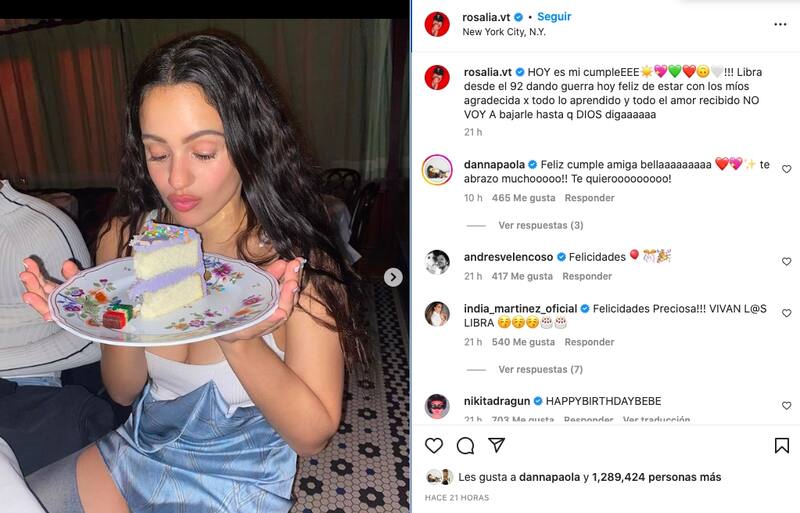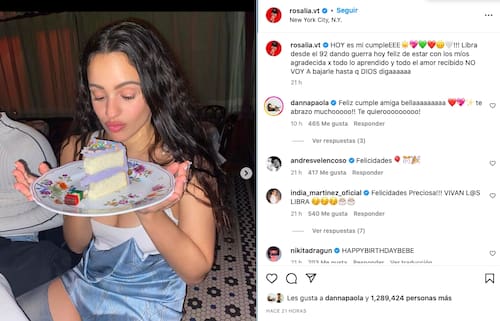 En su cuenta de Instagram, donde la primer imagen es de Rosalía con una rebanada de pastel frente a sí, escribió: "HOY es mi cumpleEEE!!! Libra desde el 92 dando guerra hoy feliz de estar con los míos agradecida x todo lo aprendido y todo el amor recibido NO VOY A bajarle hasta q DIOS digaaaaaa".