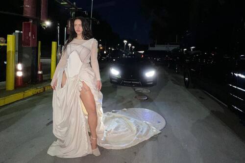Rosalía eligió un llamativo e inusual vestido deconstruido de la colección primavera-verano 2023 de la diseñadora Elena Velez: vestido en tono arena con transparencias, polisón (armazón que se usaba en el siglo 19 para abultar los vestidos por detrás) y ligeramente decontruido en la parte inferior. El vestido lleva un corsé forjado por el diseñador Andrew Curwen.